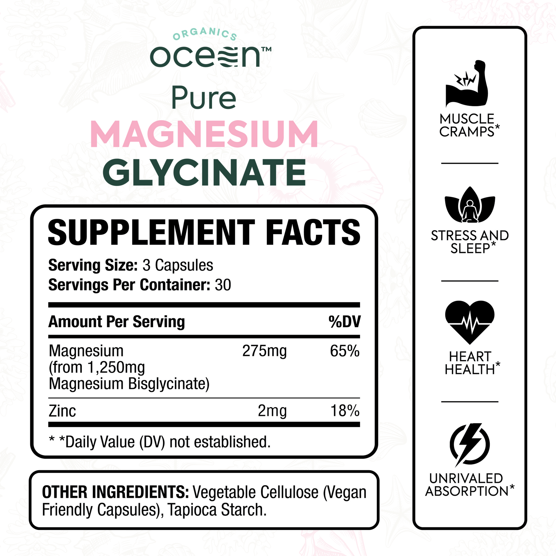 Each bottle of Pure Magnesium Glycinate contains 90 capsules.Each bottle contains 30 servings of 275 mg of magnesium and 2mg of zinc. There are 3 "half-size" capsules per serving.