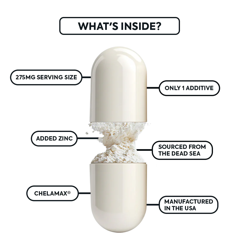 Our formula contains a hyper-purified form ofmagnesium glycinate. Sourced from the Dead Sea thenrefined in the USA, Chelamax magnesium is easy todigest, and studies claim 30%improved absorptioncompared to the leading high-end competitor.